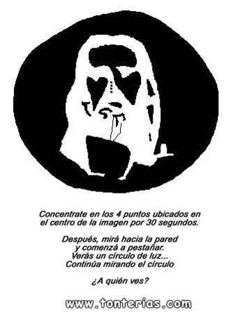 Apenas têm de se concentrar nos 4 pontos que estão no centro da imagem durante 30 segundos, aproximadamente. Depois, olhem para uma parede branca - podem pestanejar. Verão um círculo de luz - E quem vêm nesse círculo???